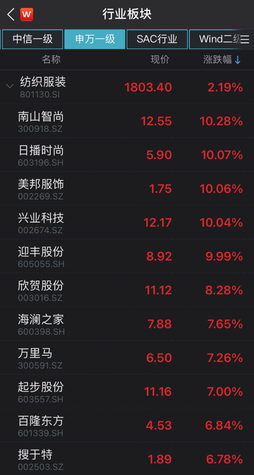 行业板块方面,截至午间收盘,纺织服装涨2.19%,涨幅居首;日播时尚、美邦服饰、兴业科技等多只个股涨停。