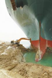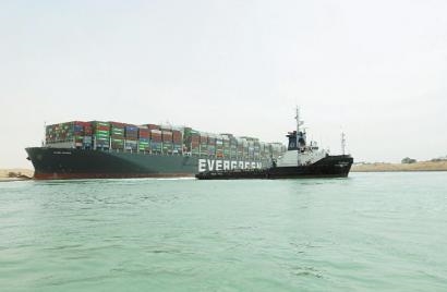 这是3月25日在埃及苏伊士运河拍摄的重型货船搁浅现场。埃及苏伊士运河管理局24日发表声明说,一艘悬挂巴拿马国旗的重型货船23日在苏伊士运河新航道搁浅,造成航道拥堵。目前,救援工作正在进行。新华社发(苏伊士运河管理局供图)