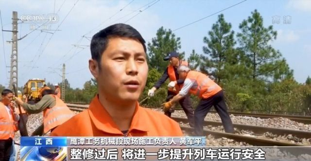 江西鹰潭工务机械段现场施工负责人 黄军平:沪昆铁路因为列车运行密度较高,轨道道床设备存在不同程度变化,我们通过调集一百余台大型养路机械和近千名职工进行大规模集中整修。整修过后,将进一步提升列车运行安全和旅客乘车舒适度。