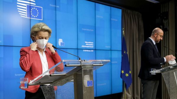 2月25日,在比利时布鲁塞尔,欧洲理事会主席米歇尔(右)和欧盟委员会主席冯德莱恩在欧盟领导人视频峰会第一日会议结束后出席新闻发布会。