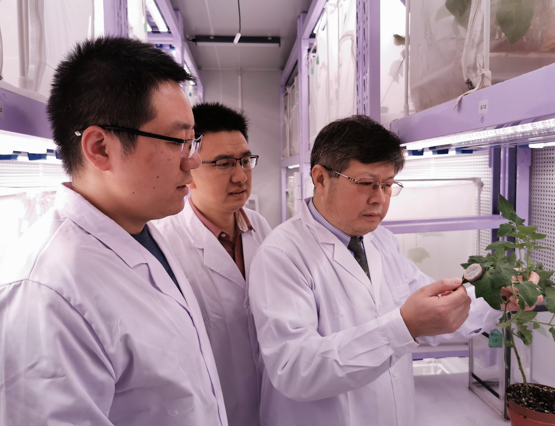 文章通讯作者张友军研究员(右一)和第一作者夏吉星副研究员(右二)、郭兆将研究员(右三)在实验室观察番茄上烟粉虱的实验情况图片由采访对象提供