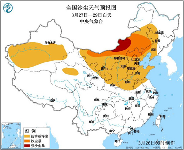 中央气象台预计3月27日至29日白天,受蒙古气旋影响,北方地区将出现大范围沙尘天气,新疆东部和南疆盆地、青海西北部、内蒙古、宁夏、甘肃中东部、陕西中北部、山西、河北、北京、天津、山东、河南、安徽北部、江苏北部及辽宁西部、吉林西部、黑龙江西南部等地有扬沙或浮尘天气,其中,内蒙古中西部和东南部、河北北部、北京北部、辽宁西部等地的部分地区有沙尘暴,内蒙古中部偏北地区有强沙尘暴。期间,内蒙古、华北北部、山东半岛、辽宁西部和半岛等地将有4~6级风,阵风风力可达7~9级。与3月14日至18日强沙尘暴天气过程相比,此次沙尘天气过程强度略弱,沙尘暴影响位置偏东,强沙尘暴范围偏小,扬沙或浮尘向南传输范围略小。