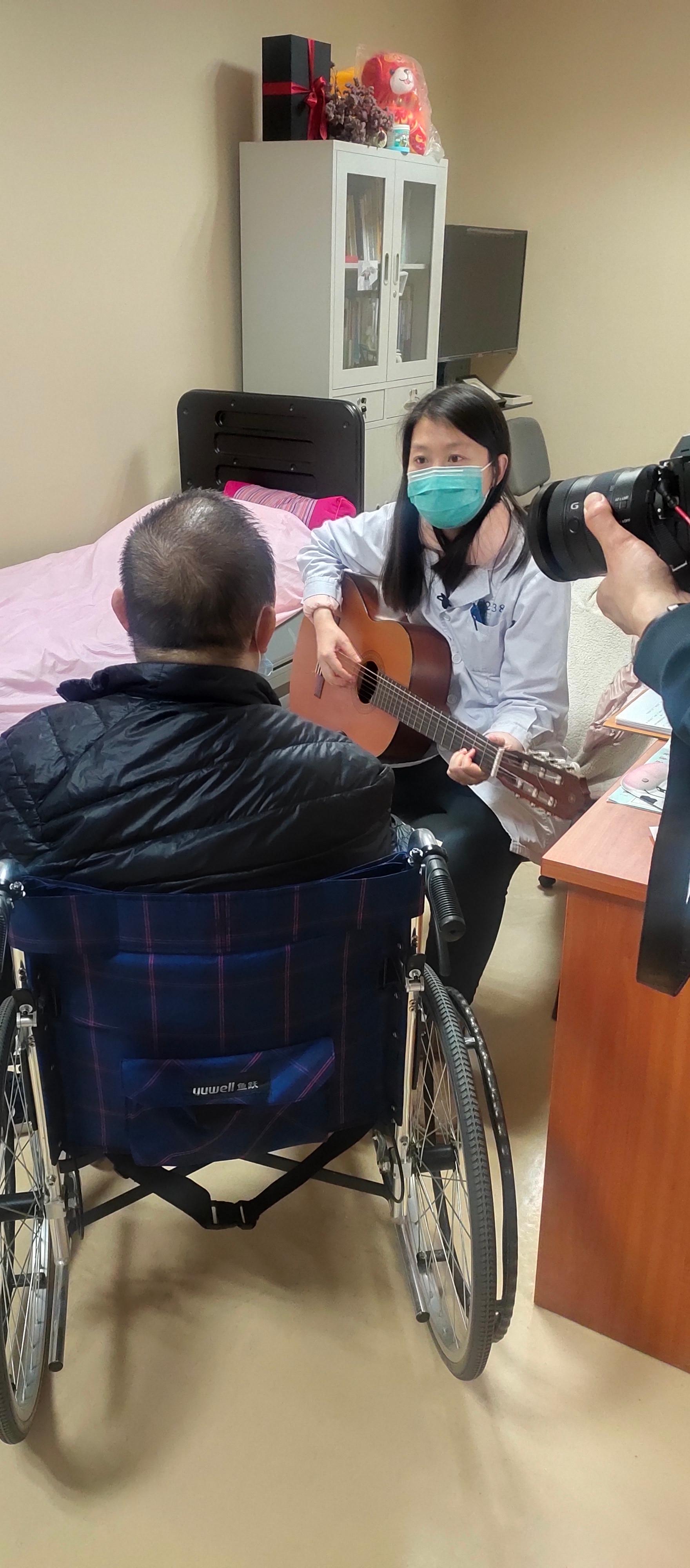张晓颖为病人弹唱他熟悉的歌曲,引导其“唱”出日常用语。新华社记者 王晓洁 摄