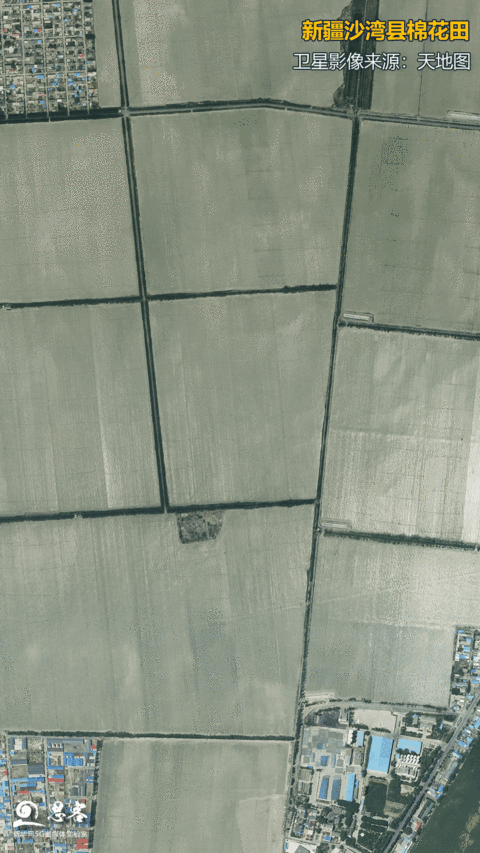 图为新疆沙湾县棉花田。在卫星信号导航下,精准种植出的棉花笔直且行距均等,场面蔚为壮观。卫星影像来源:天地图