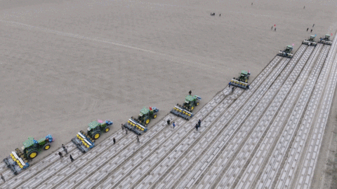 在新疆生产建设兵团第六师共青团农场的棉花地中,一辆装有北斗导航系统的多功能一体化无人驾驶精量播种机在田间播种。新华社记者 王菲 摄