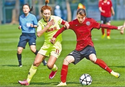 图为3月25日,陕西女足球员袁雅蒙(右)在比赛中拼抢。在当日的比赛中,陕西女足以2∶1战胜河南女足。
