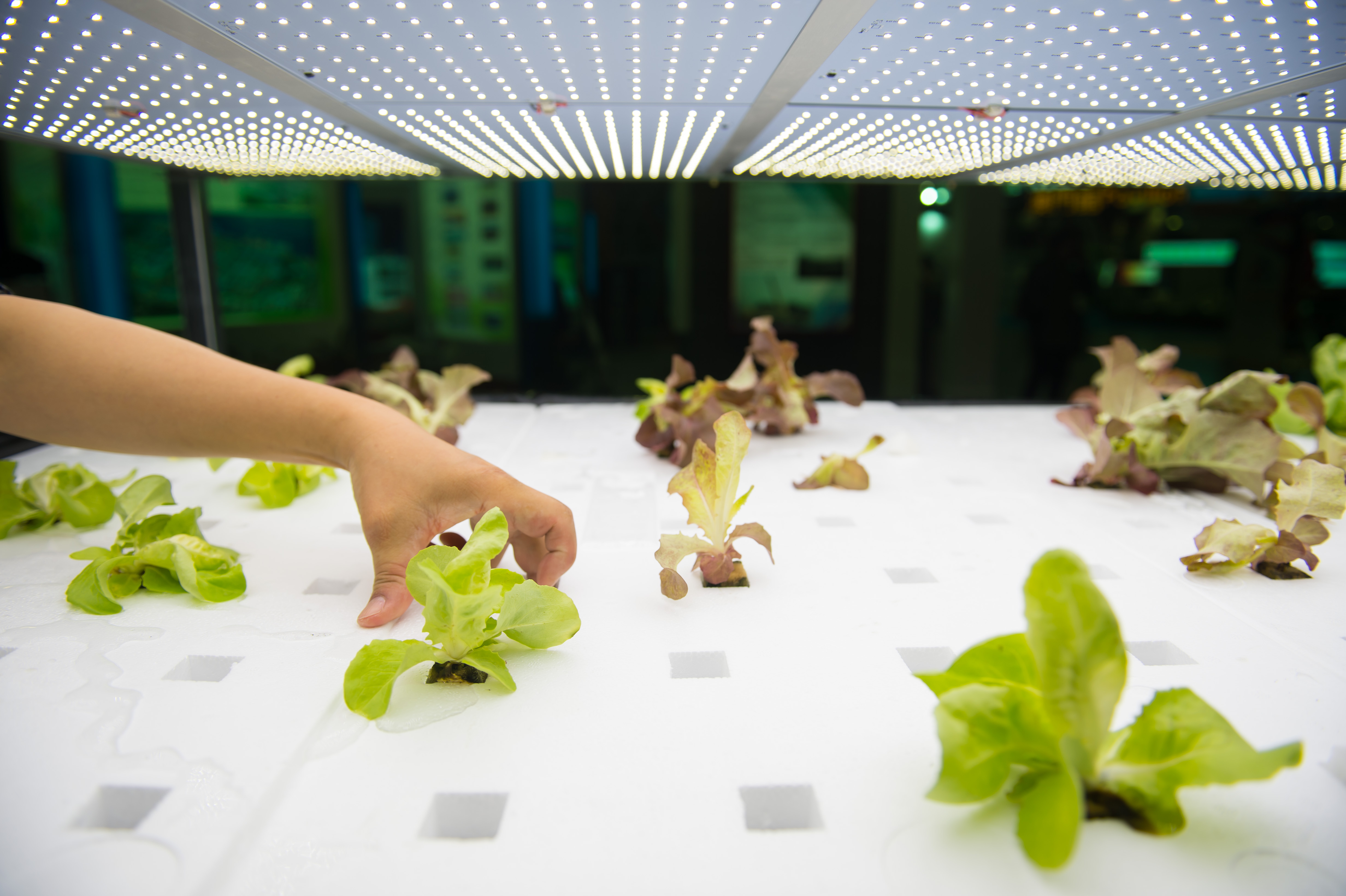 记者看到,在大棚顶部装有促进蔬菜进行光合作用的各式特制灯管,可按需求调控灯光颜色和光照强度,以培植绿色、紫色蔬菜。棚内配有空调、传感器和电脑,可调控温度、湿度、光照等。技术人员随手摘下几片菜叶示范着吃下,并表示这个区块产出的蔬菜在当地市场供不应求。