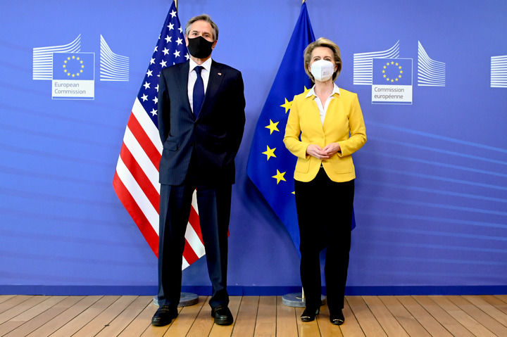 3月24日,欧盟委员会主席冯德莱恩(右)在比利时布鲁塞尔迎接到访的美国国务卿布林肯。新华社发