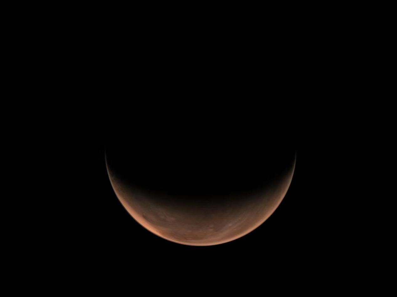 今天(3月26日),国家航天局发布2幅由我国首次火星探测任务天问一号探测器拍摄的南、北半球火星侧身影像。图像中,火星呈“月牙”状,表面纹理清晰。