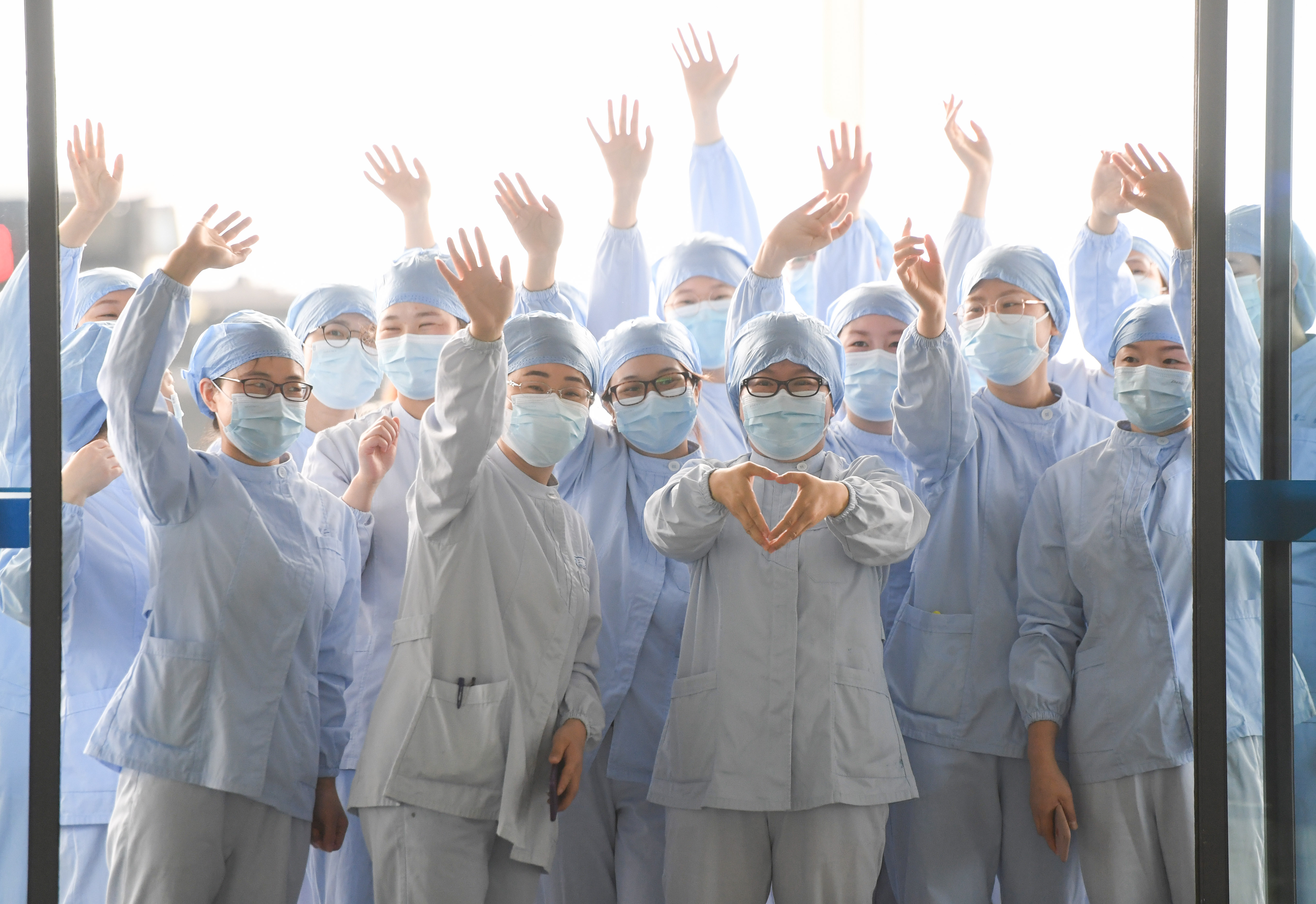 2020年3月23日,在武汉天河机场,湖北省武汉市第一医院医护人员为广东第14批援鄂医疗队送行。新华社记者 陈晔华 摄