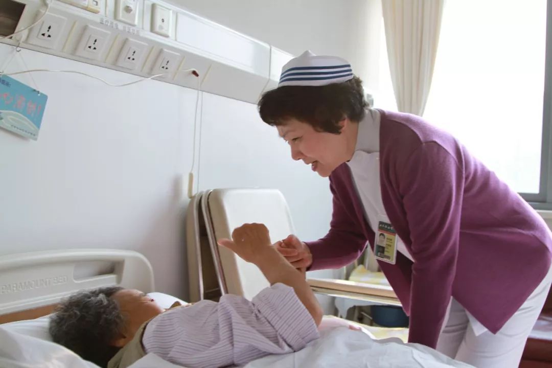 中华护理学会会长、南丁格尔奖获得者吴欣娟在病房内与患者互动交流。新华社记者 胡喆 摄