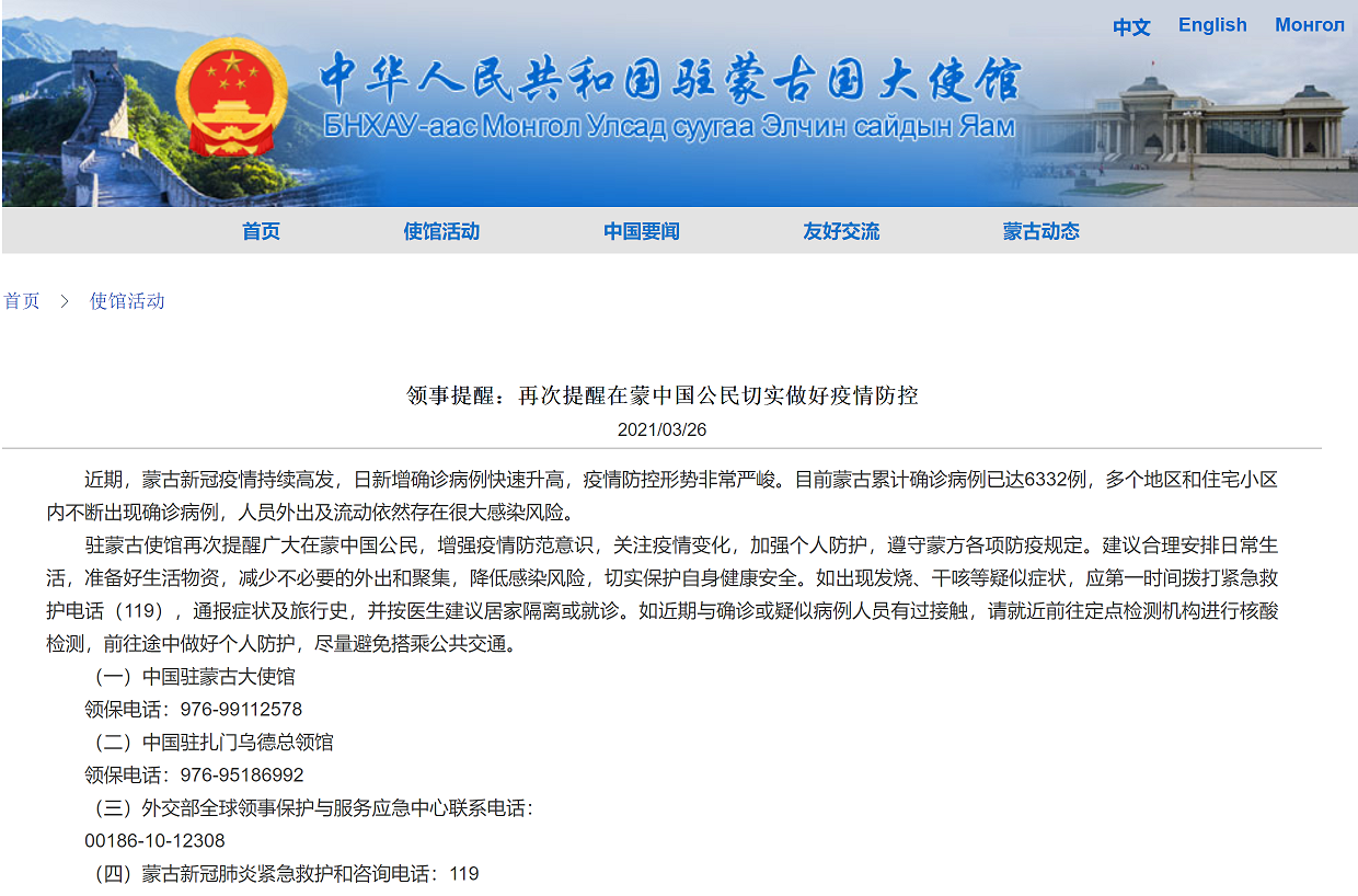 当地时间3月26日,中国驻蒙古国大使馆发出领事提醒,近期蒙古国新冠肺炎疫情持续高发,单日新增确诊病例数快速升高,疫情防控形势非常严峻。目前蒙古国累计确诊病例已达6332例,多个地区和住宅小区内不断出现确诊病例,人员外出及流动依然存在很大感染风险。