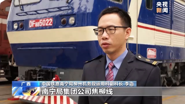 中国铁路南宁局柳州机务段运用科副科长 李治:此次实施新的列车运行图后,南宁局集团公司焦柳线、湘桂线、黔贵线等6条线路,货物列车的运行时速由原来的每小时80千米提速至每小时90千米,在列车运输时间、能力、成本等方面都有明显改善。