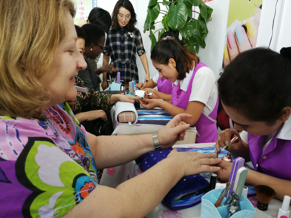 2019年8月30日,8国常驻日内瓦外交官参访新疆积极评价经济社会发展及去极端化举措。图为南非常驻日内瓦代表团副代表内莉亚(左)在和田县职业技能教育培训中心体验学员美甲技能。新华社记者刘兵摄