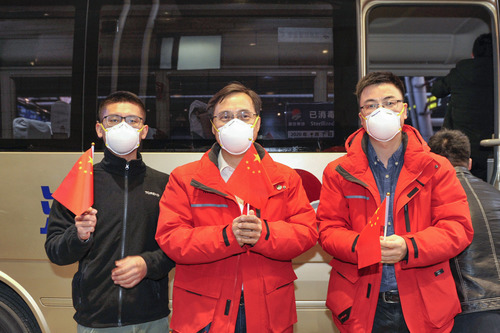 2020年4月7日,第一批国家中医医疗队领队、中国中医科学院院长黄璐琦(中)等第一批国家中医医疗队3名队员圆满完成援助湖北医疗任务,平安返京 新华社记者 张玉薇 摄