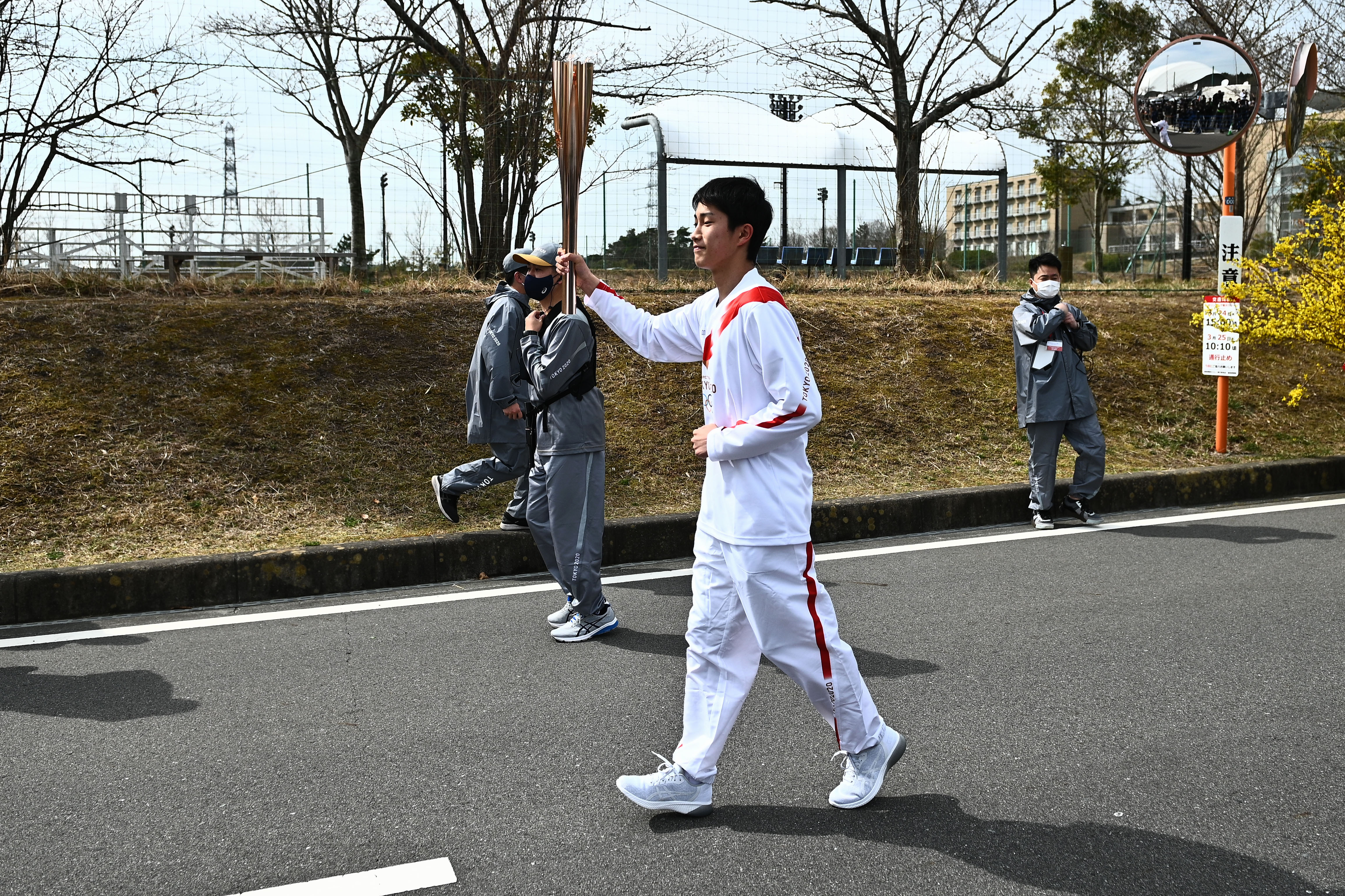 日本高中生大和田朝斗作为火炬传递手传递圣火。新华社/POOL/方家远