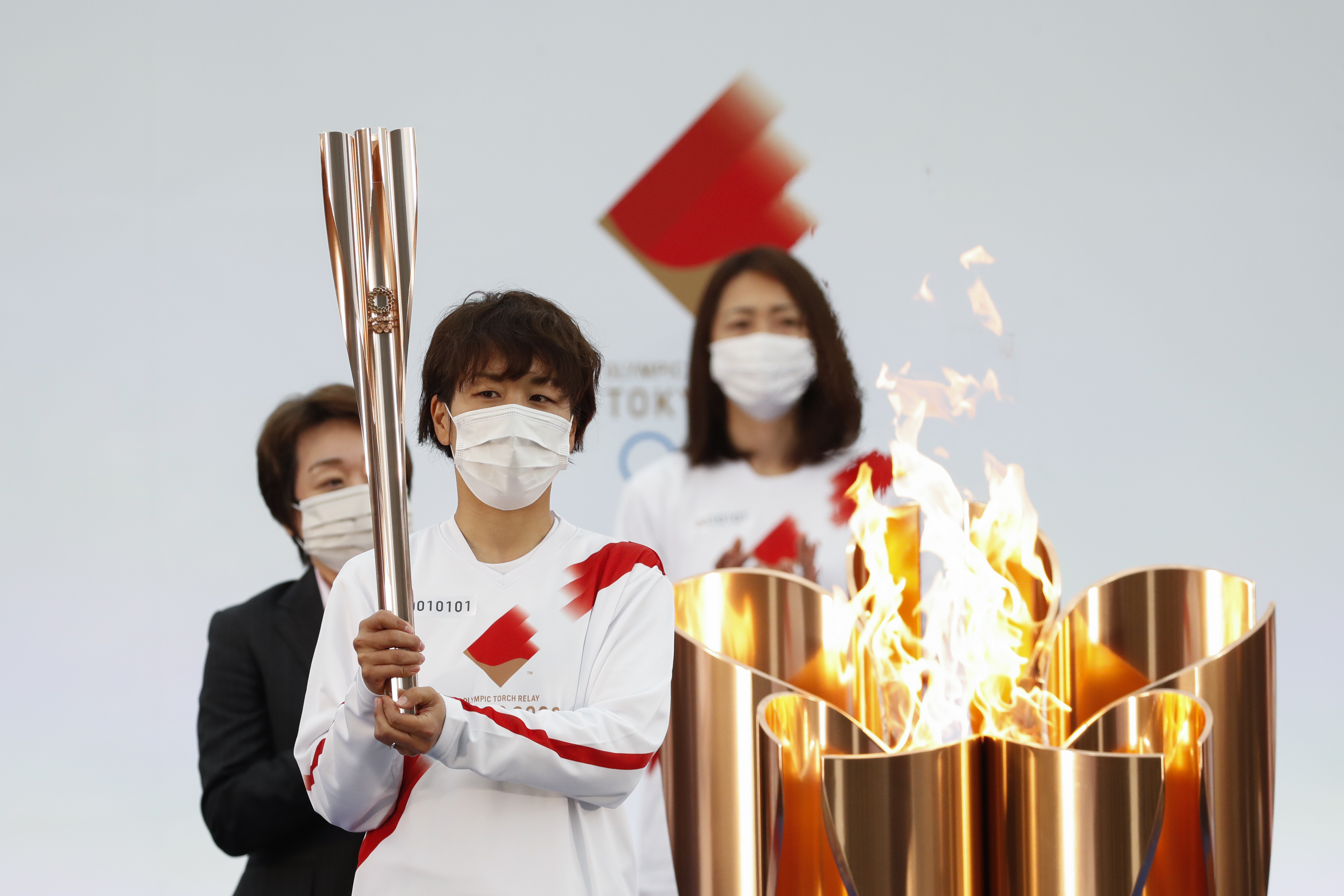 3月25日,日本女足运动员岩清水梓(左)准备用圣火点燃手中的火炬。新华社/POOL/金敬勋