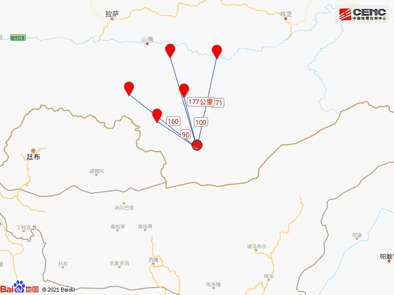 周边县城。震中距错那县90公里、距隆子县100公里、距措美县160公里、距朗县171公里、距曲松县177公里,距山南市210公里,距拉萨市282公里。