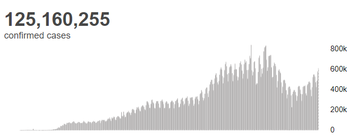 根据世卫组织最新实时统计数据,截至欧洲中部时间3月26日16时44分(北京时间3月26日23时44分),全球累计新冠肺炎确诊病例125160255例,累计死亡病例2748737例。26日,全球新增新冠肺炎确诊病例614570例,新增死亡病例9396例。(总台记者 朱赫)