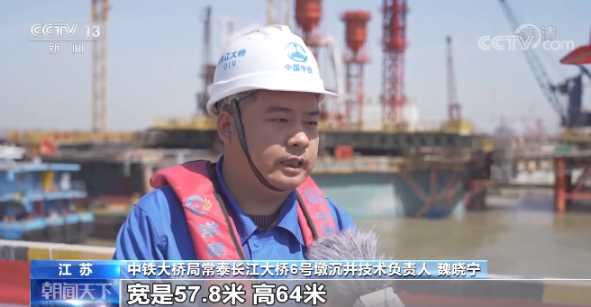 中铁大桥局常泰长江大桥6号墩沉井技术负责人 魏晓宁:我们6号墩沉井长是95米,宽是57.8米,高64米,我们这个6号墩的封底混凝土是从今年的2月份开始浇筑,截止到现在累积浇筑49000立方米。
