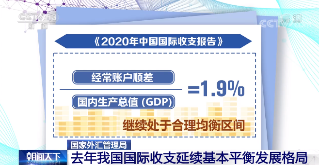 央视网消息:国家外汇管理局昨天(26日)发布了《2020年中国国际收支报告》,2020年我国国际收支延续基本平衡发展格局。 数据显示,2020年我国外汇储备规模稳定在3.2万亿美元左右。经常账户顺差增加,与国内生产总值之比为1.9%,继续处于合理均衡区间。