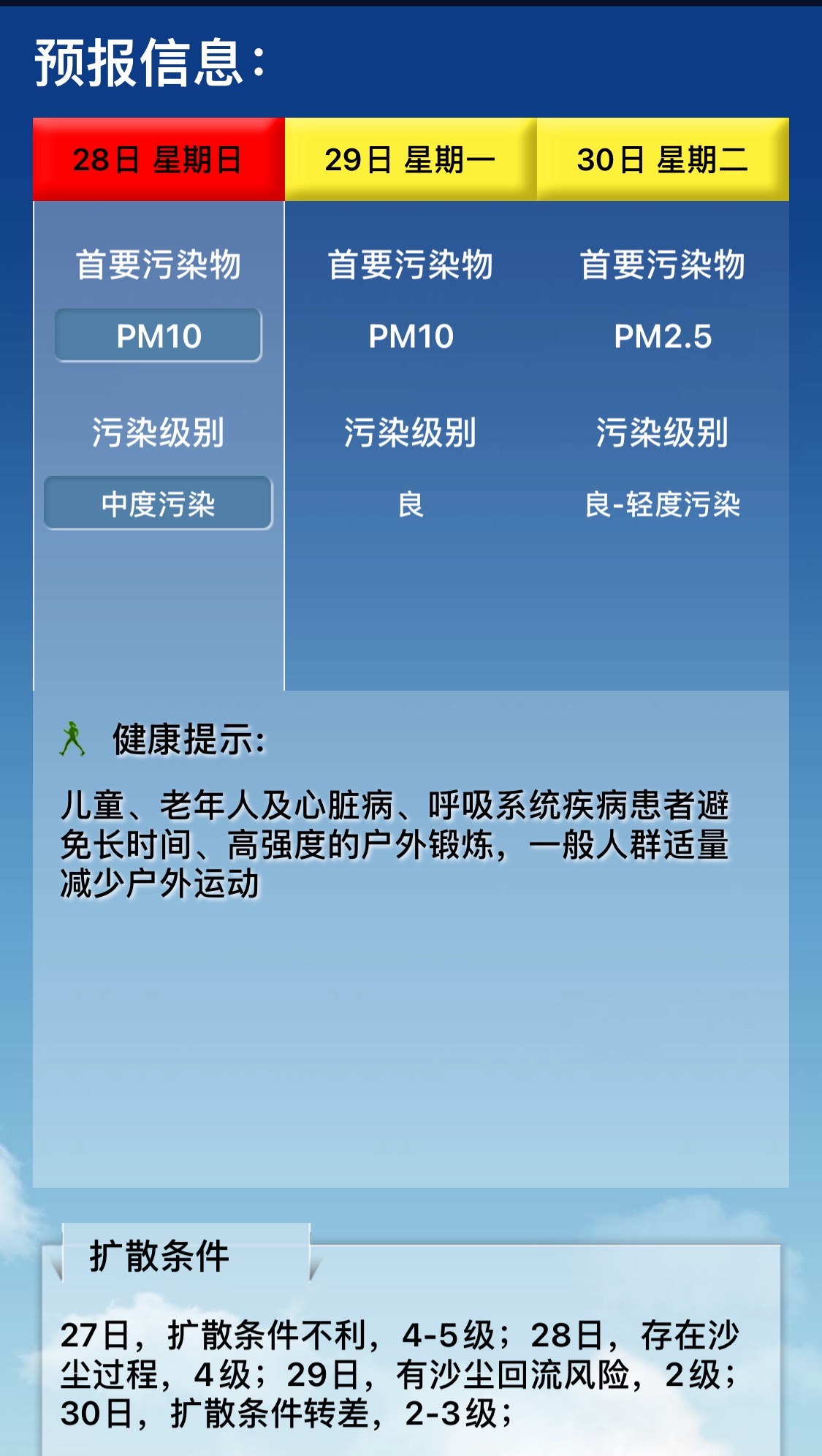 其中,北京市预计于周六(27日)夜间至周日(28日)凌晨开始受到沙尘过境影响,空气质量以严重污染为主;29日沙尘主体过境后,空气质量逐步改善。