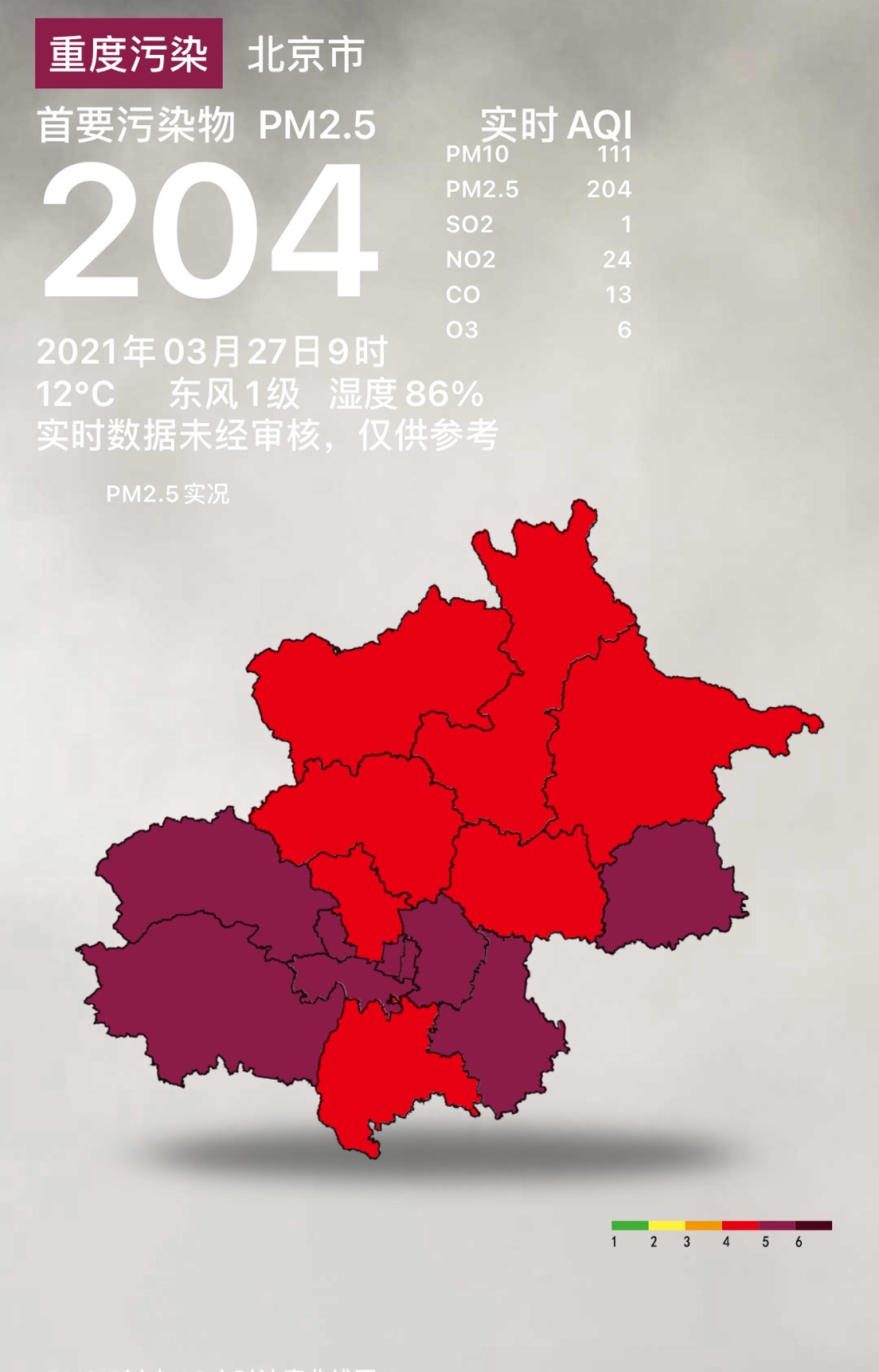 北京市生态环境监测中心发布消息,截至今天9时,北京实时空气质量指数上升至204,达到重度污染水平,首要污染物为PM2.5。