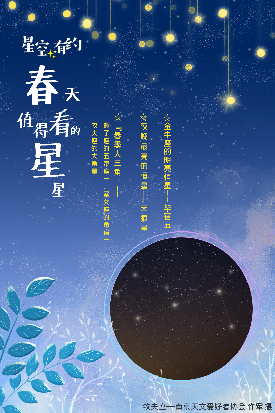 还有一些明亮的星星,春季夜晚处于地平线上,非常适于观测。比如,狮子座的五帝座一、室女座的角宿一以及牧夫座的大角星都是有名的亮星,它们排列成三角形悬挂在夜空中,组成有名的“春季大三角”。春季上半夜,还能看到夜晚最亮的恒星——天狼星以及金牛座的明亮恒星——毕宿五。