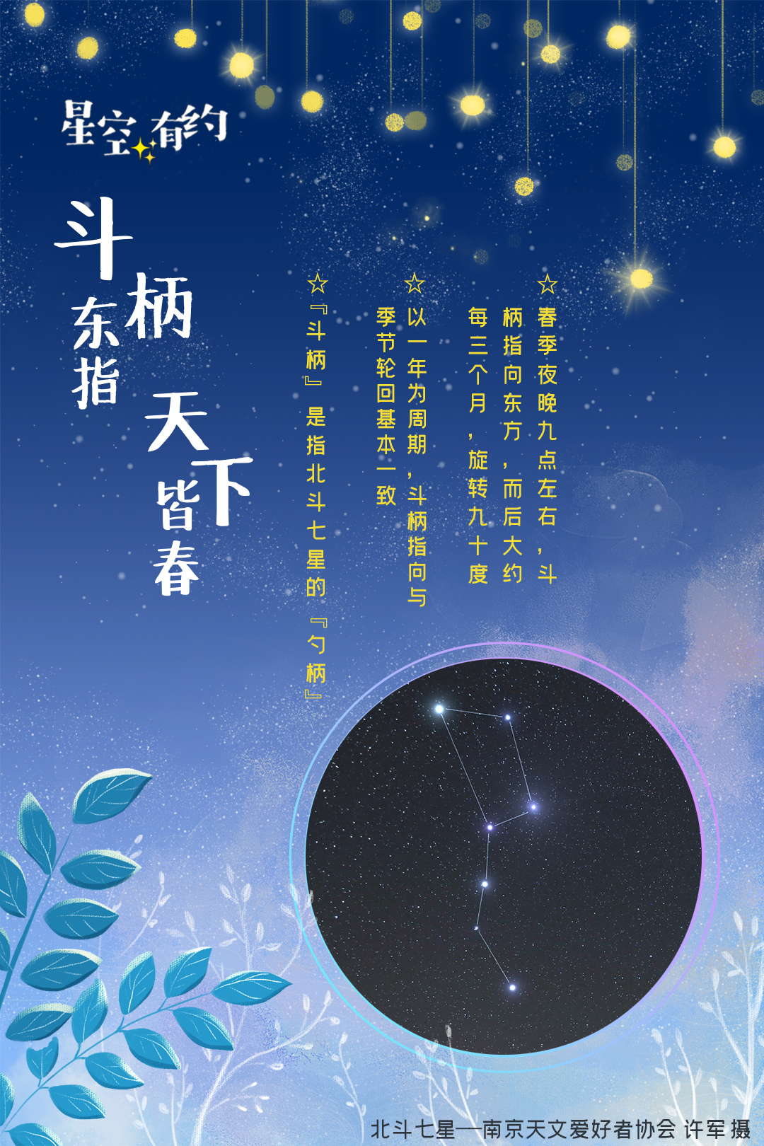 紫金山天文台科普部主管胡方浩介绍,所谓“斗柄”是指北斗七星的“勺柄”。北斗七星是北部天空中七颗明亮的星星,它们总体排列成一个勺状,其中四颗星呈“斗勺”形状,其余三颗星呈“斗柄”形状。在我国北方,这个“大勺”总是处在地平线以上,围绕北极星旋转。随着地球围绕太阳做公转运动,人们每晚看到的斗柄指向总是处在缓慢变化之中。