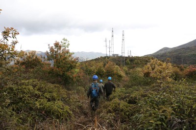 经过大约3个小时的跋涉,大家终于登到山顶,累得满头大汗。只见远处的电力铁塔高高耸立,电线从一个山头通向另一个山头,延伸向远方。