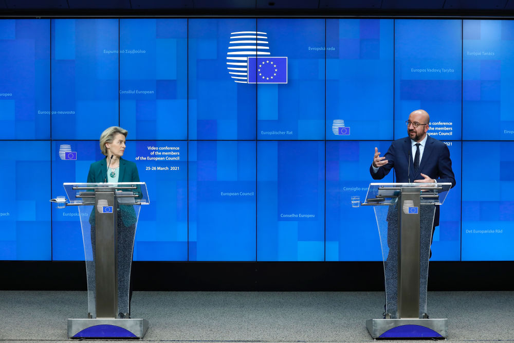 3月25日欧盟春季峰会第一天会议后,欧盟委员会主席冯德莱恩(左)和欧洲理事会主席米歇尔在比利时布鲁塞尔出席新闻发布会。(新华社发,欧盟供图)