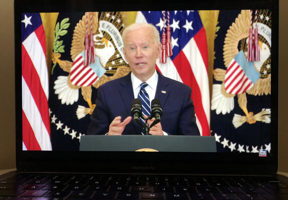 3月25日在美国弗吉尼亚州阿灵顿拍摄的视频画面显示,美国总统拜登在华盛顿白宫举行的记者会上讲话。(新华社记者刘杰摄)