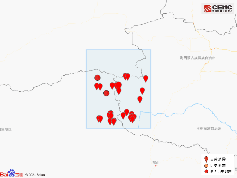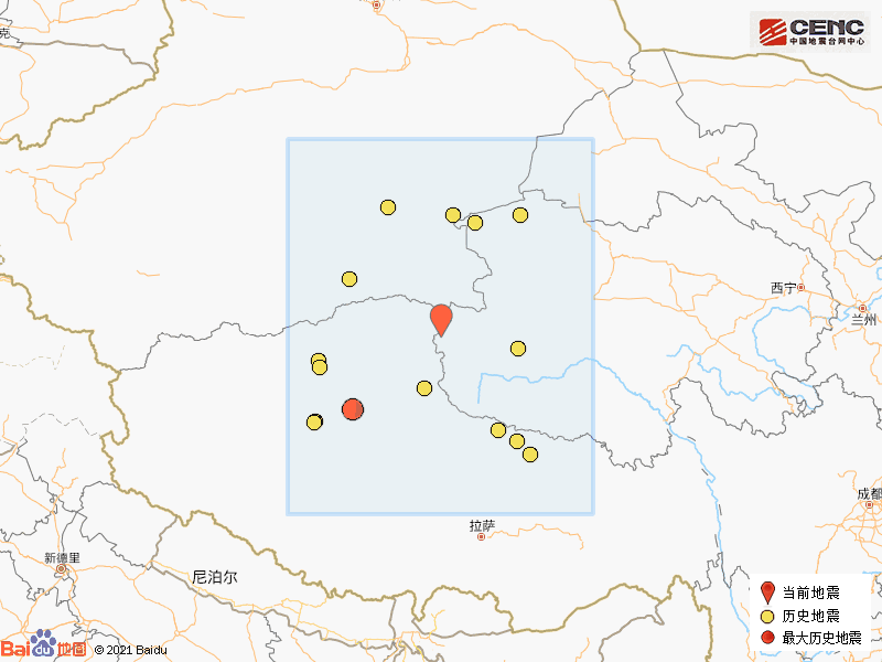 震中周边500公里内近10年来发生5级以上地震共19次,最大地震是2020年7月23日在西藏那曲市尼玛县发生的6.6级地震(距离本次震中371公里),历史地震分布如图。