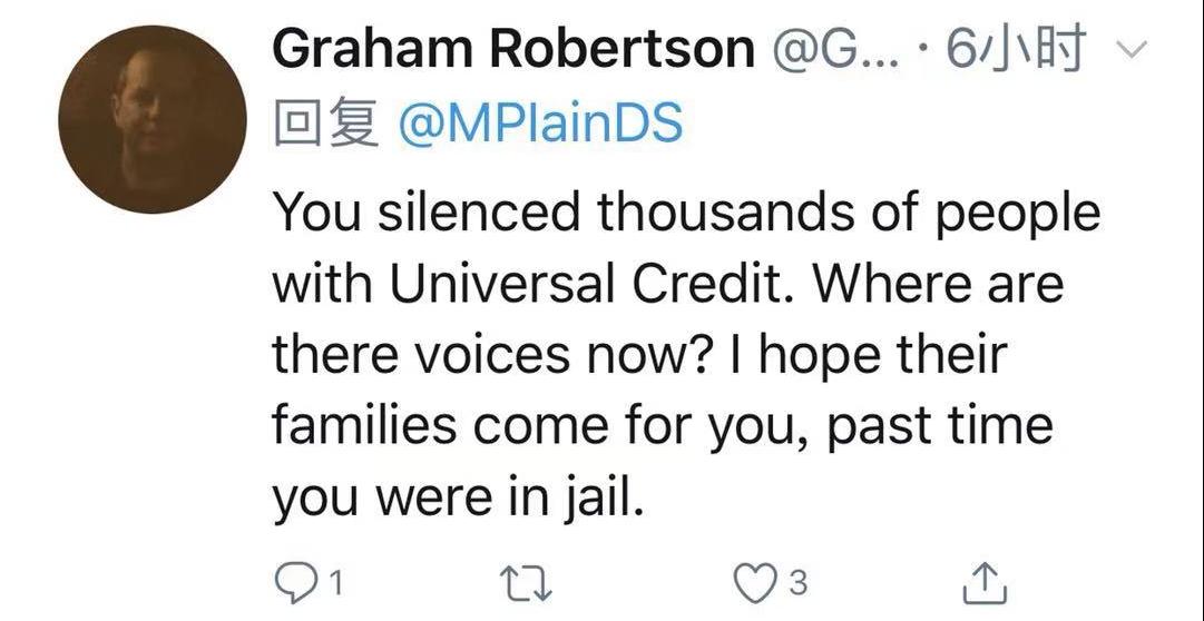 “你阻止成千上万的英国低保民众发声,他们的声音在哪里?我希望他们的家庭能够找到你,如果是过去的的话,你应该在监狱里。”