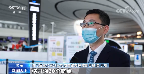 厦门航空北京分公司地面服务保障部总经理 于培:厦航在大兴机场将开通30个航点,每天(执行)将达到100个航班。