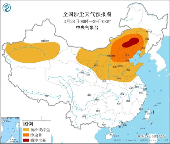 受冷空气大风影响,预计3月28日白天,新疆南疆盆地和东部、青海东北部、内蒙古大部、甘肃河西及东部、宁夏、陕西中北部、山西、河北、北京、天津、河南北部、山东、辽宁中西部、吉林西部、黑龙江西南部等地有扬沙或浮尘天气,其中,内蒙古中部和东南部、山西北部、河北中北部、北京、天津、辽宁西部等地的部分地区有沙尘暴,内蒙古中部偏南地区及东南部有强沙尘暴。28日夜间起,上述地区沙尘天气强度减弱,以扬沙或浮尘为主,但内蒙古东南部、辽宁西部等地仍有沙尘暴。