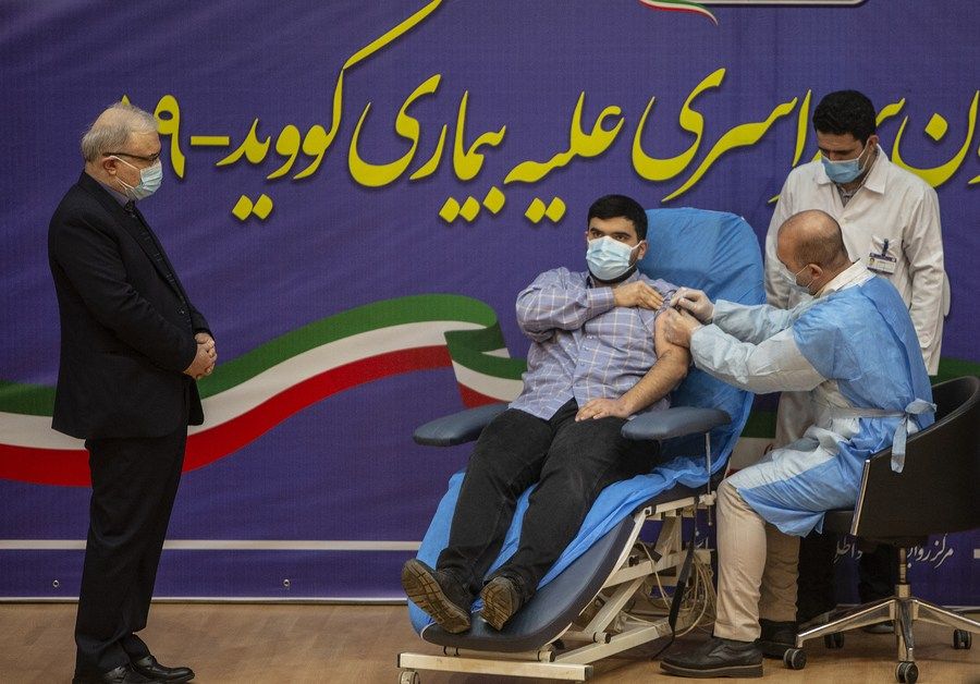 2月9日,在伊朗德黑兰,医务人员为接种者注射新冠疫苗。(新华社发,艾哈迈德·哈拉比萨斯摄)