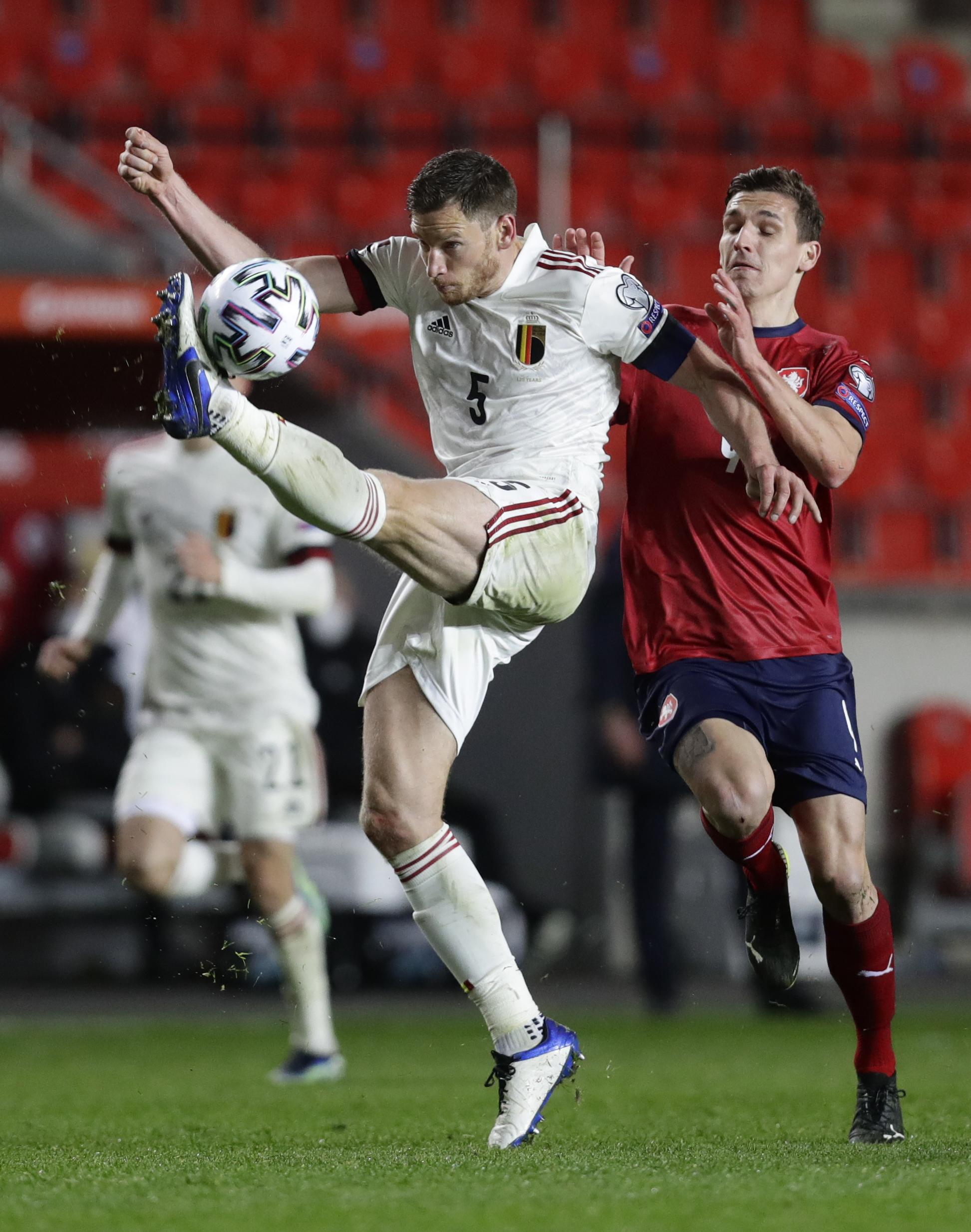 3月27日,比利时队球员维尔通亨(左)和捷克队球员帕维尔卡拼抢。新华社/路透
