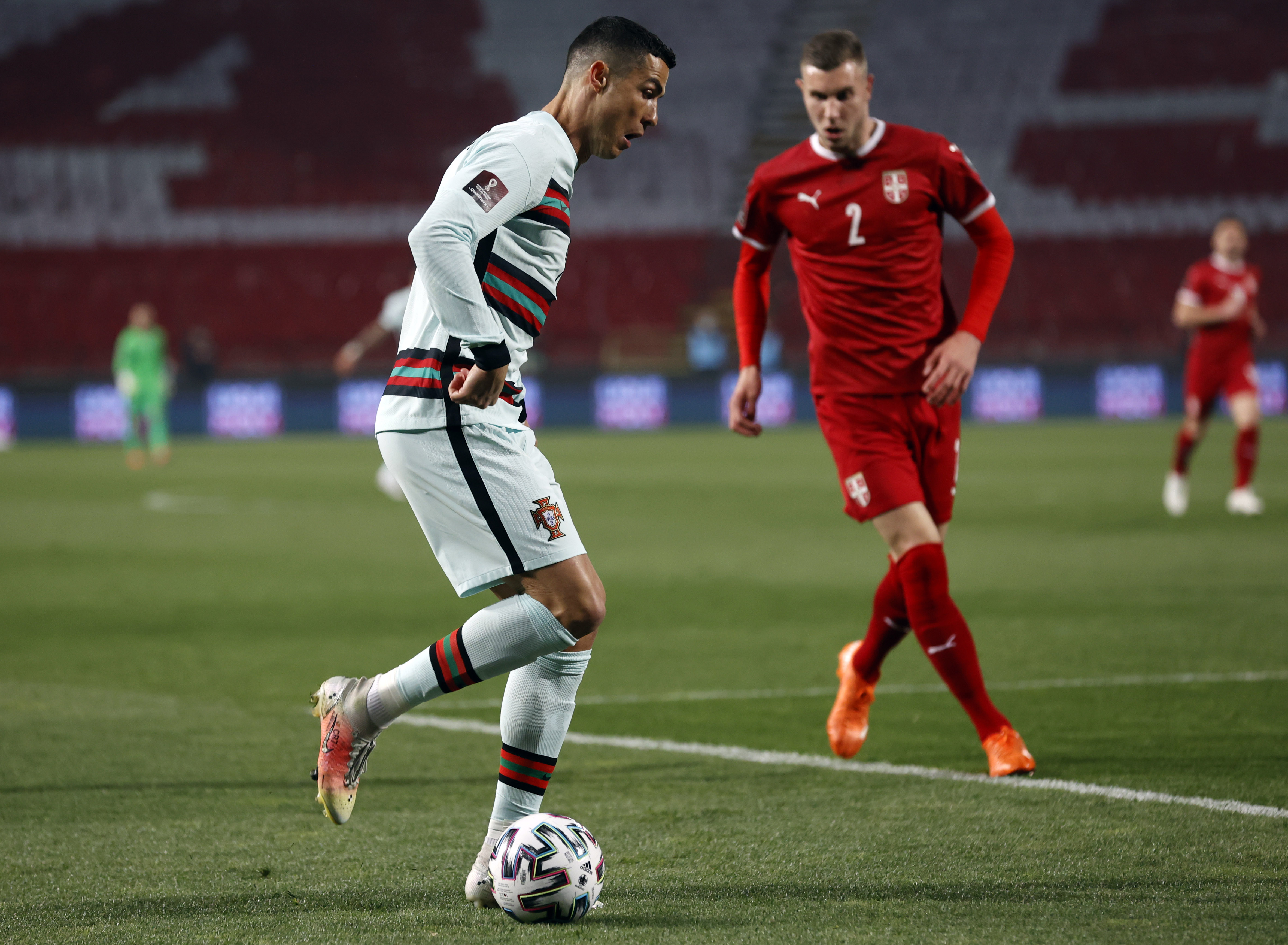 3月27日,葡萄牙队球员克·罗纳尔多(左)在比赛中带球。新华社发(普雷德拉格·米洛萨夫列维奇摄)