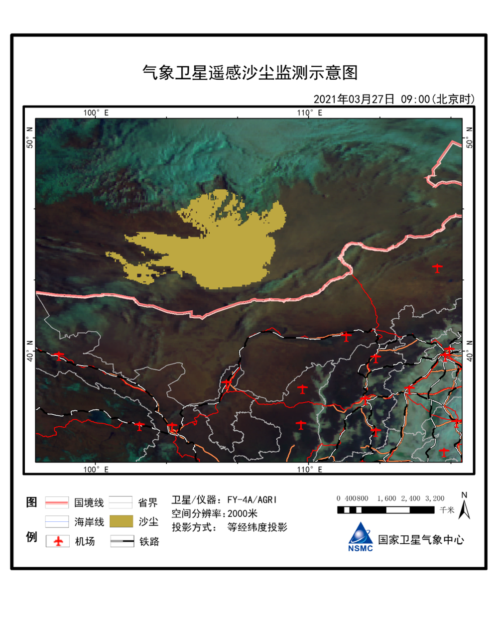 FY-4A气象卫星监测显示,受东移蒙古气旋云系的影响,3月27日凌晨开始,蒙古国南部和东部出现沙尘天气(黄色区域)。
