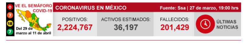 当地时间3月27日,墨西哥卫生部宣布,截止到3月27日晚上7点,墨西哥全国累计新冠肺炎确诊病例2224767例,较前一天新增了4922例;累计死亡病例201429例,较前一天新增567例。(总台记者 盛嘉迪 吕兴林)