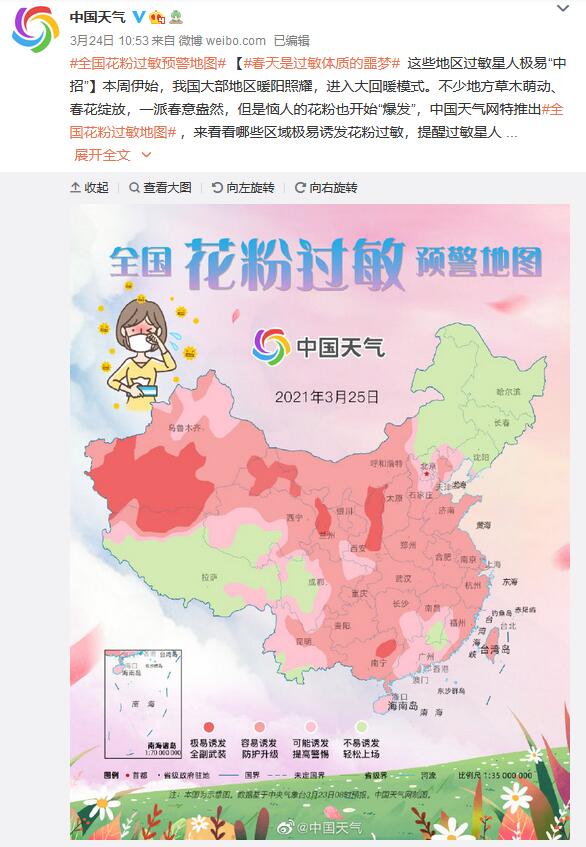 到了春暖花开的季节,花粉也随之而来。针对有些人对花粉过敏的现象,中国天气网还制作了“全国花粉过敏预警地图”,标明了不同地区的花粉过敏诱发程度。地图显示,未来两天中东部大部地区容易诱发花粉过敏,山东、河南、江苏、安徽、湖北、浙江等省份过敏指数持续偏高,提醒公众要注意防护。