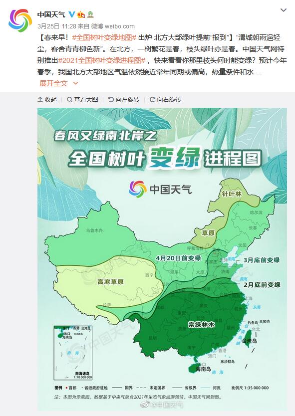 而预计今年春季,我国北方大部地区气温依然接近常年同期或偏高,因此北方落叶乔木的绿叶将提前3至7天“报到”。预计3月底之前,甘肃、陕西、山西部分地区的树叶都将变绿。随着春风的脚步继续向北,4月20日之前,华北、内蒙古、东北等地的树叶也将变绿。