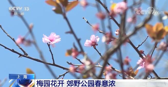 在上海长兴岛郊野公园,公园步道和河道两岸遍布着盛开的鲜花,特别是梅园内的梅花在阳光下鲜艳欲滴,吸引了众多游客前来观赏。