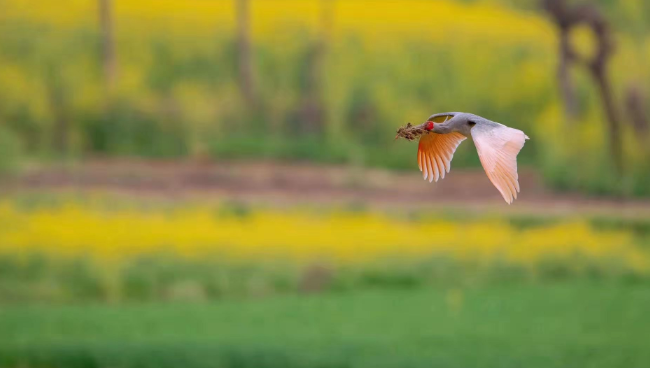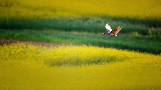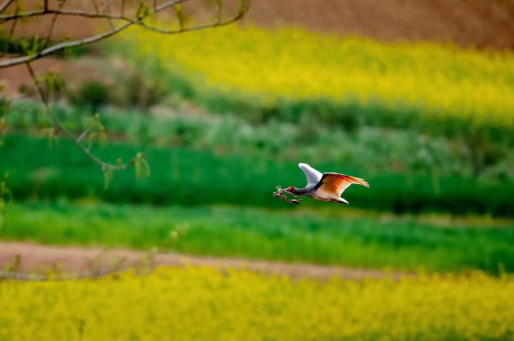 近日,陕西汉中120万亩油菜花进入盛花期。天地间油菜花田犹如一张金色地毯,在山水间铺陈开来,仿佛一幅油画。国家一级保护鸟类朱鹮在明媚的春光中飞过油菜花海,如同一只只舞蹈的精灵。