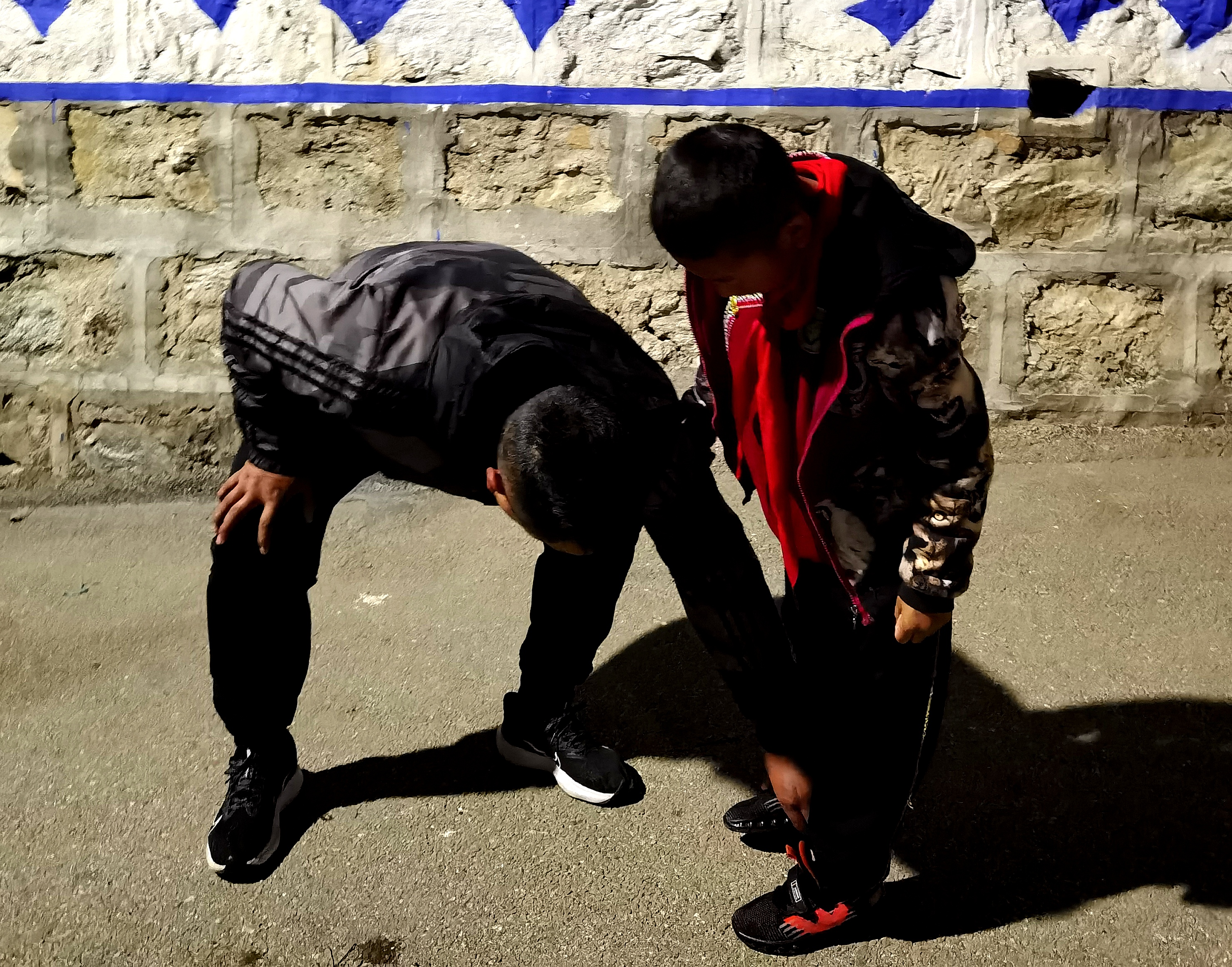 上午6点10分,校园广播开始播放《歌唱祖国》,所有寝室亮灯,孩子们陆续出门,走向操场。格桑站在低年级宿舍楼外,弯着腰,盯着孩子们的脚。看到鞋带没系好、鞋扣没粘紧的,赶忙叫住,给孩子整理。