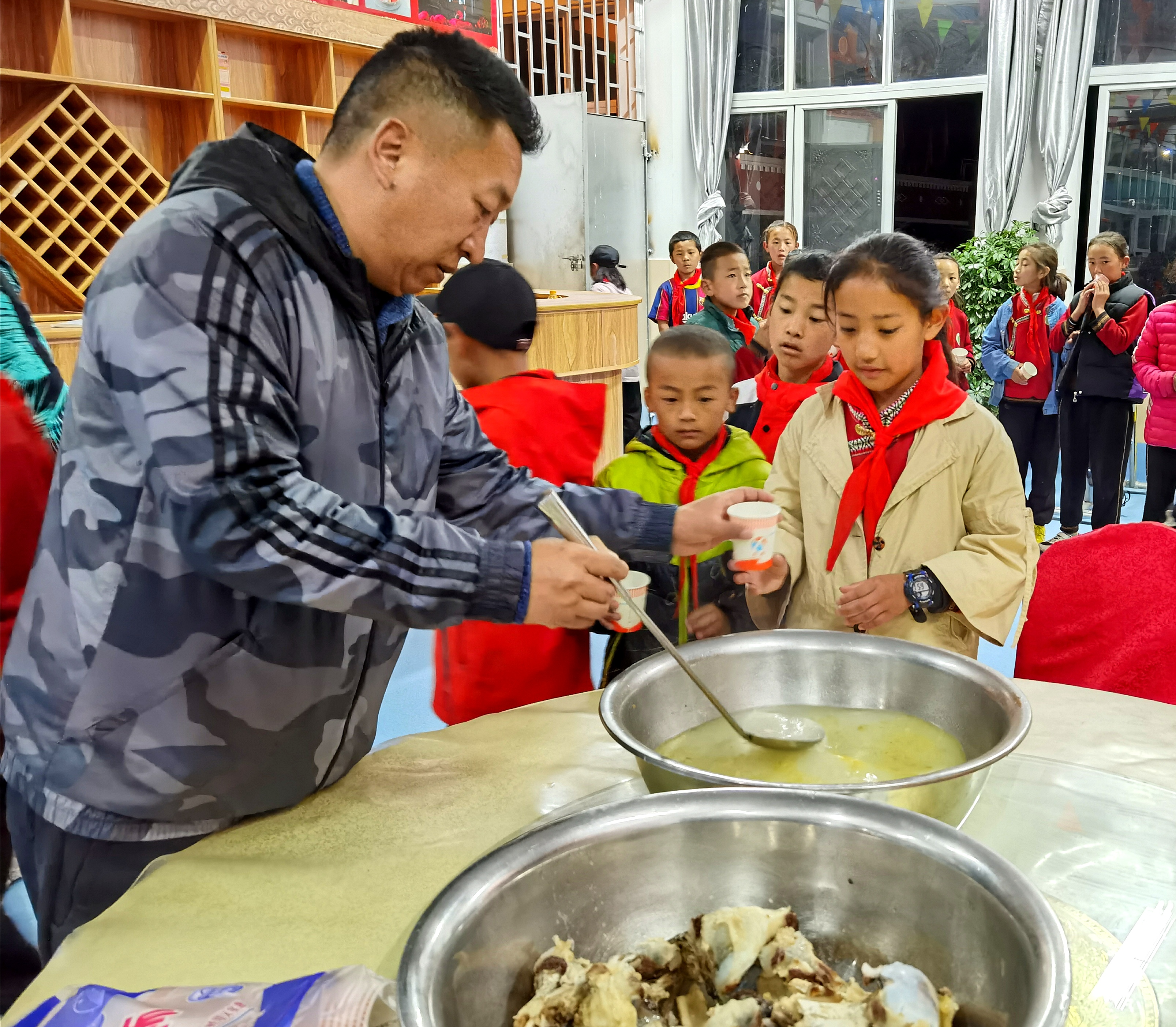 6点40分,孩子们奔向食堂。馒头、牛奶、鸡蛋开启一天的能量摄入。满头大汗的足球队员在一口大盆前排起了队。“校队体力消耗大,这是给他们熬的牦牛骨头汤。”格桑给拿着纸杯的孩子每人盛了一勺。
