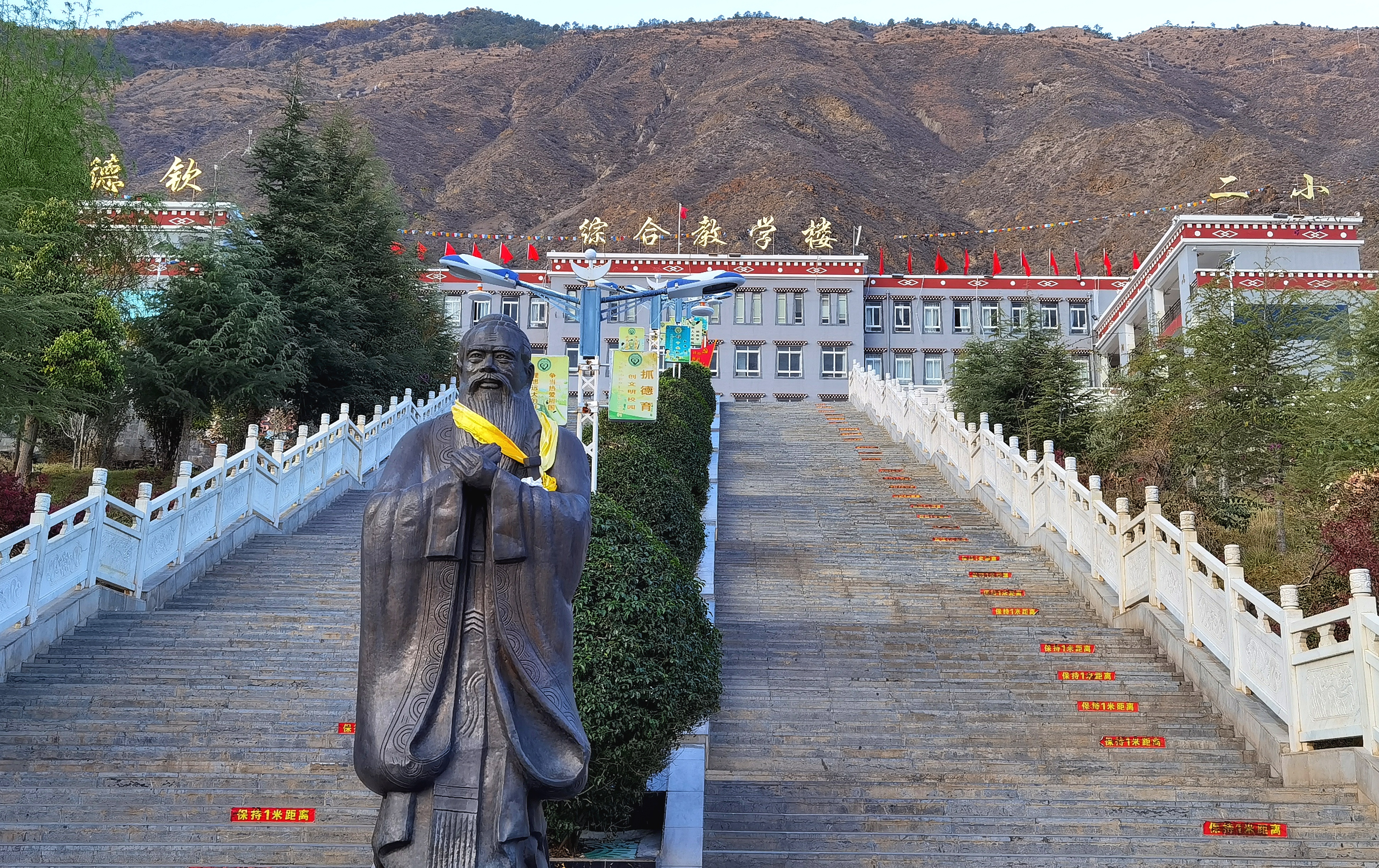 德钦二小位于云南迪庆藏族自治州德钦县奔子栏镇。校园建在半山,从大门到教学楼,得先爬一个陡坡,上135级台阶,才能到操场。每间教室的窗外都能看到奔腾的金沙江水。全校868名学生99%都是藏族,家最远的离学校200多公里。孩子每年寒暑假回家两次,平时跟老师一起住校。