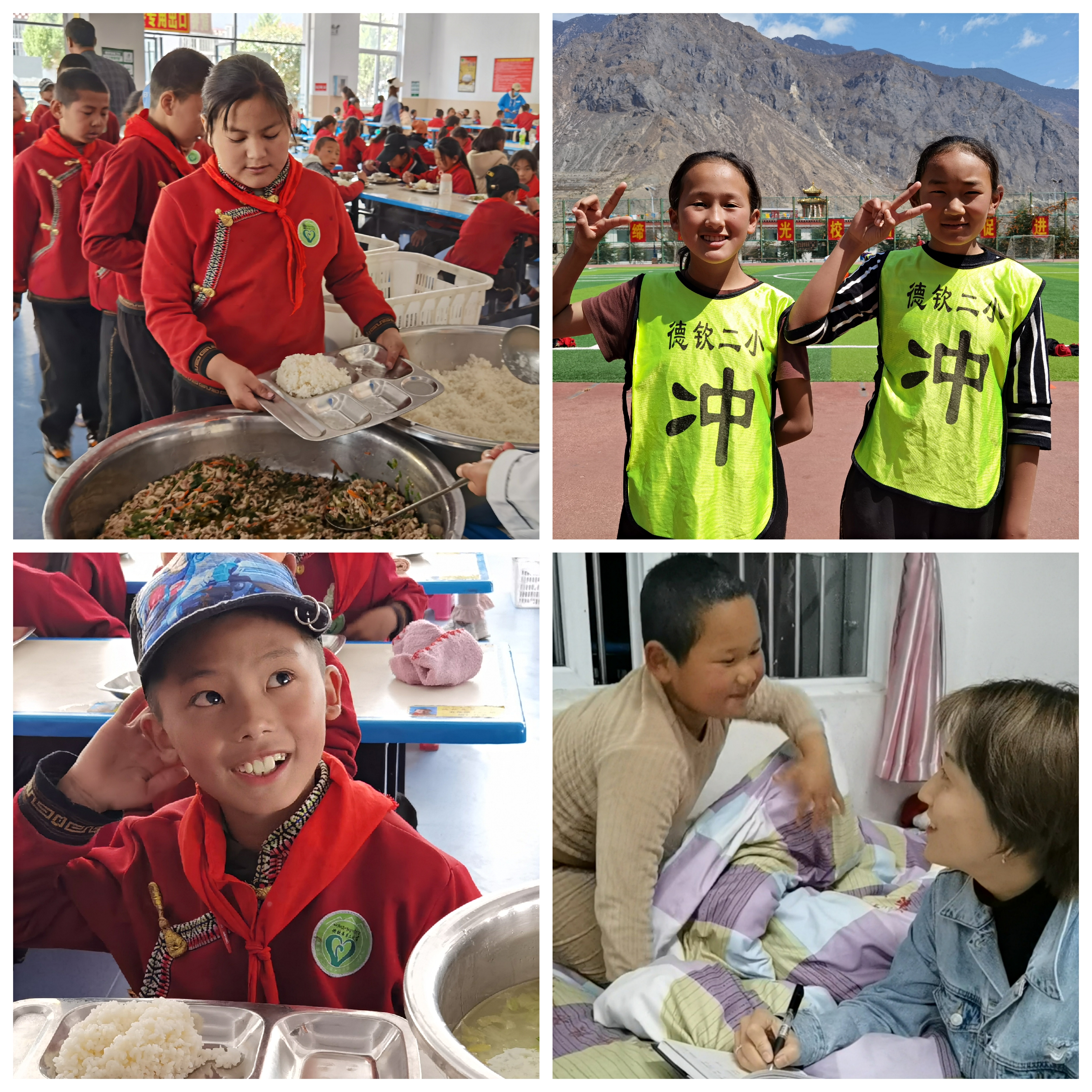 10点大课间,师生齐跳由锅庄改编成的广播操。德钦小学没有午睡习惯,中午一个小时也用来运动,校队训练,其他孩子则跟老师玩跳绳和篮球。晚上6点到7点,校队最后一练。晚9点全校熄灯。