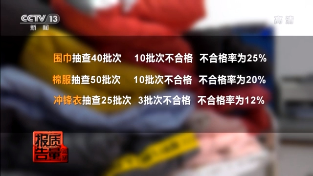 江苏省市场监管局监督处副处长 郭亮:这次监督抽查我们江苏省市场监管局主要在羽绒服、羽绒被等六大类冬令服装抽查了350批次,一共发现43批次不合格,不合格发现率为12.3%。